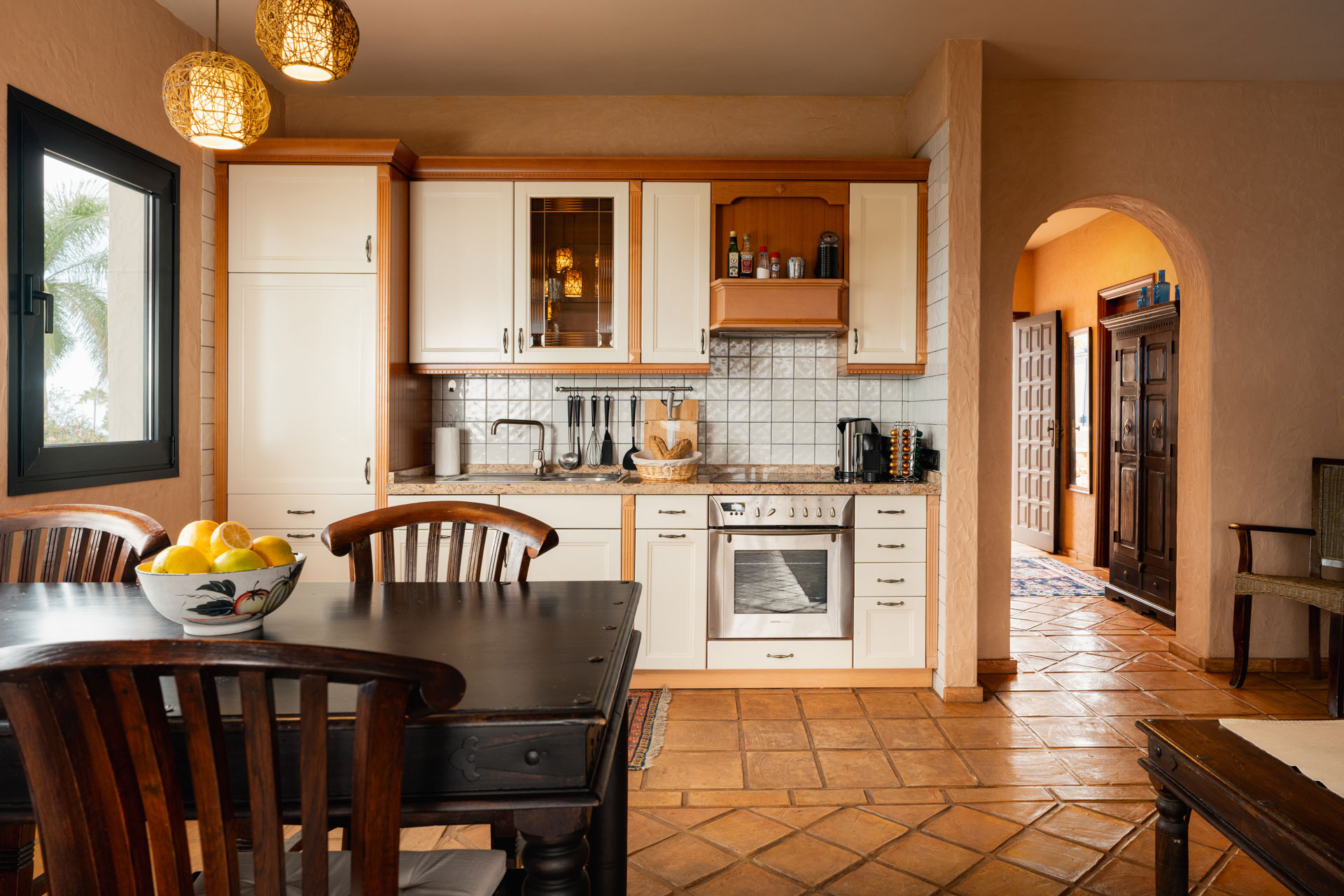 Die Villa bietet drei Schlafzimmer und zwei Bäder, sowie einen sehr großzügigen Wohn- und Essbereich mit Gasfeuerstelle. Das Feuer sorgt für besondere Akzente und auch an den wenigen kühlen Tagen im Jahr für Wohlbefinden. Die Antikholzküche ist ein weiteres echtes Highlight. Die Komplettaustattung mit Geschirrspülmaschine, Vier-Platten-Cerankochfeld, Mikrowelle, Backofen, Kühl- Gefrierkombination, Nespresso Kaffeemaschine, Toaster usw. lässt keine Wünsche offen. Eine Waschmaschine, Trockner sowie eine Bügeleinrichtung befinden sich in dem angeschlossenen Vorratsraum.