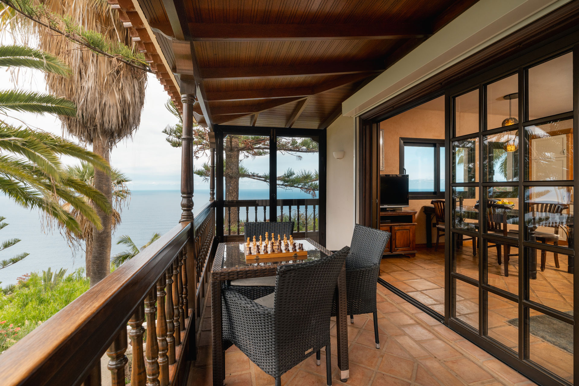 Auf der weitläufigen Terrasse können Sie die Seele baumeln lassen – Sonne tanken oder auch ein Glas Wein trinken und den Blick auf das Meer und den Teide genießen. Von der Terrasse führt eine private Aussentreppe hinunter in den Wellnessbereich mit Sauna und Hallenbad.